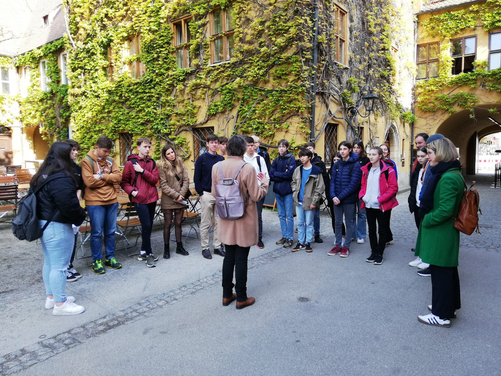 After a short lunch break, the programme included an interview with a descendant of Jakob Fugger, Maria Theresia Countess Fugger von Glött, in the Fuggerei. The questions, such as “What is it like to be a member of the Fugger family?”, “What do you do for a living?”, “Is everyone in your family rich?” or “Where is all the Fugger family money now?” were worked out by the pupils in advance and uploaded online. Afterwards, there was still plenty of time for spontaneous questions.