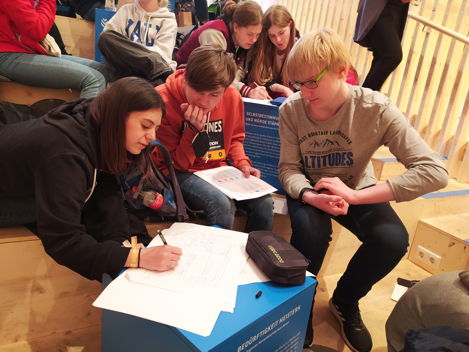 Thanks to the Erasmus+ project at Jakob Fugger Gymnasium, we were able to visit this exhibition pavilion as well. After we got a detailed guided tour to get to know the history of the Fuggerei better, we were allowed to create a sketch of our own idea of how another Fuggerei could look like in the future in groups. In doing so, everyone proceeded according to different priorities: While sustainability played a major role for some, for others it was more important to create a model for different groups of people (e.g. single mothers) in different countries around the world. In summary, it was a very diverse experience and a great first step into the near future.