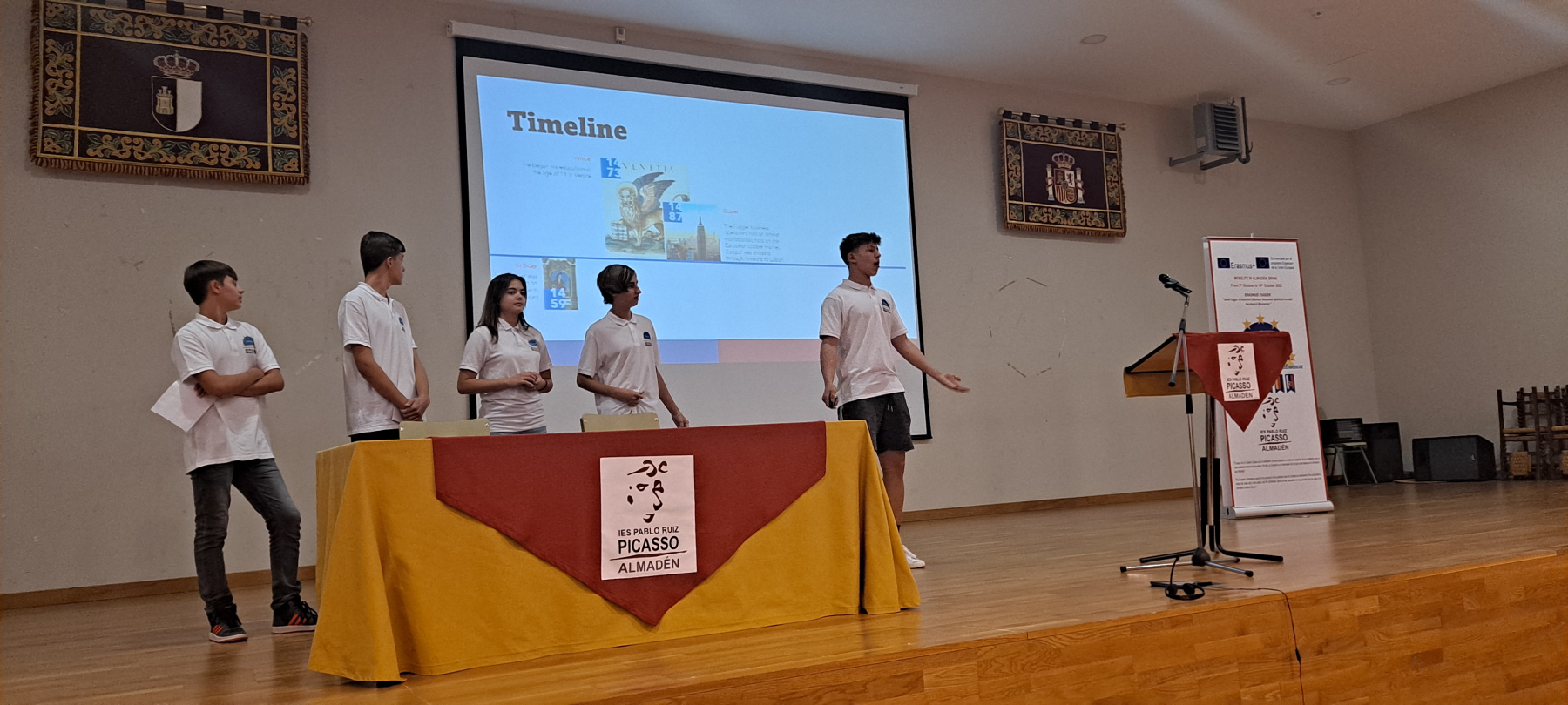 The 3rd Erasmus+ student mobility took place from October 8th to 14th, 2022 in Almadén, Spain. The groups from Augsburg, Banská Bystrica and Sterzing took very early flights to have the opportunity to visit the city center of Madrid on Saturday. Thanks to Katharina Dehner from the Fugger and Welser Museum in Augsburg, who visited Almadén with the Erasmus+ groups as part of the European Fugger Road, and who has lived in Madrid for some time of her life and offered her knowledge and experience of life in the city, the pupils learnt a lot of interesting information about the history and present of Madrid. After meeting the group from Belgium in the afternoon at the airport, the whole group travelled to Almadén by bus where they were finally warmly welcomed by their Spanish hosts.