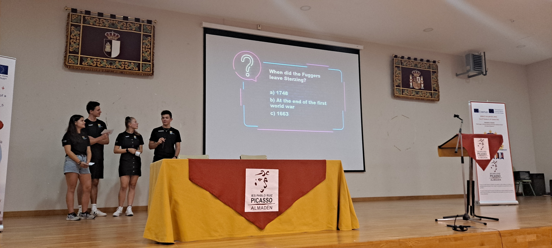 The reception was held on Monday at the center by the Director Mr. José María Villalón. In addition, the dynamics of group work that we were going to carry out was explained to all the students. After a guided visit of the bullring arena the group was received by the mayoress of Almadén: Doña María del Carmen Montes at the town hall of Almadén. In the evening, the “Fugger-Forum” with the title “Footsteps of Jakob Fugger” took place in the auditorium of the center, with the participation of experts from Spain, Mr. Angel Hernández –  and from Germany – Mrs. Katharina Dehner from the Fugger and Welser museum Augsburg.