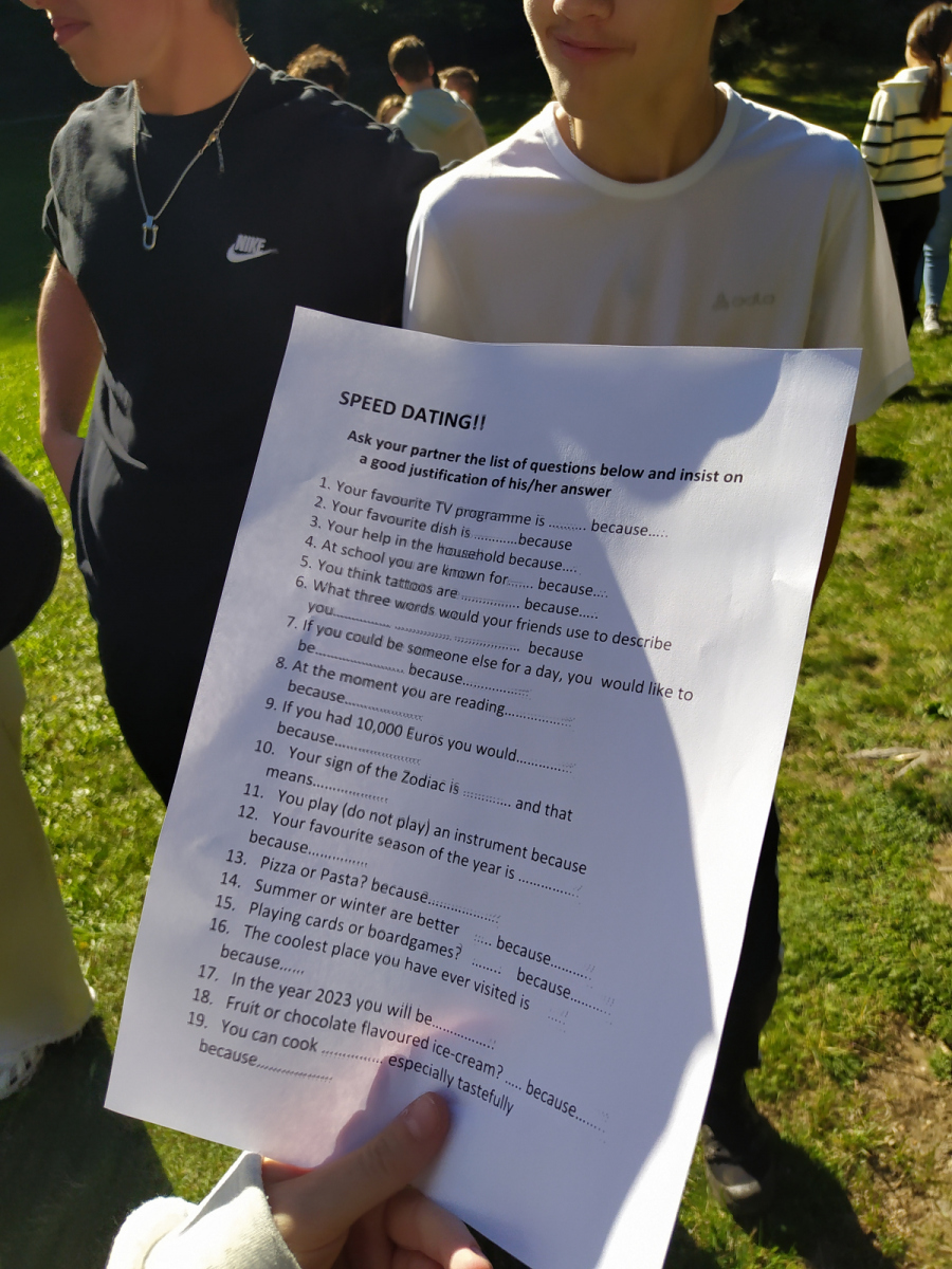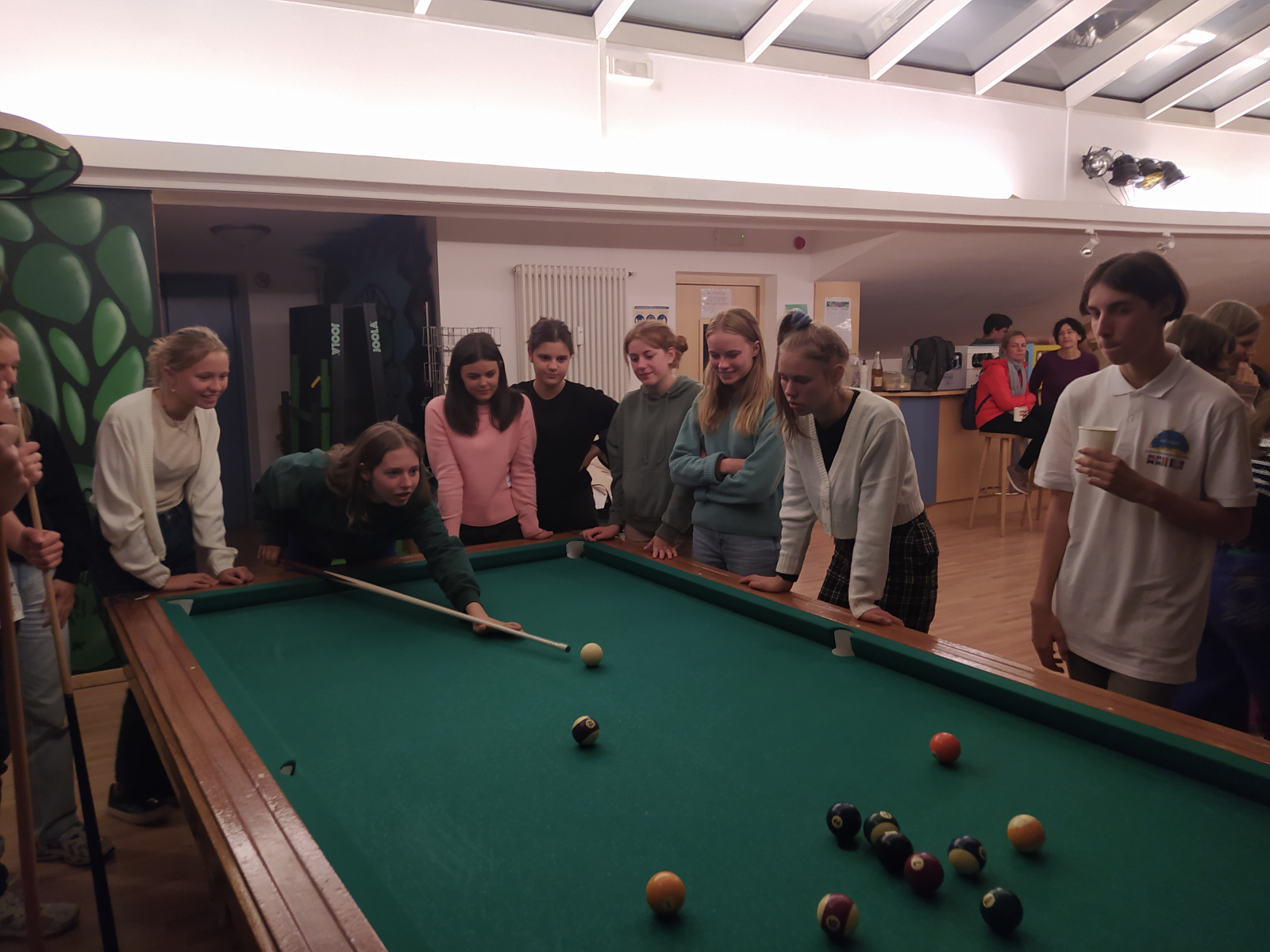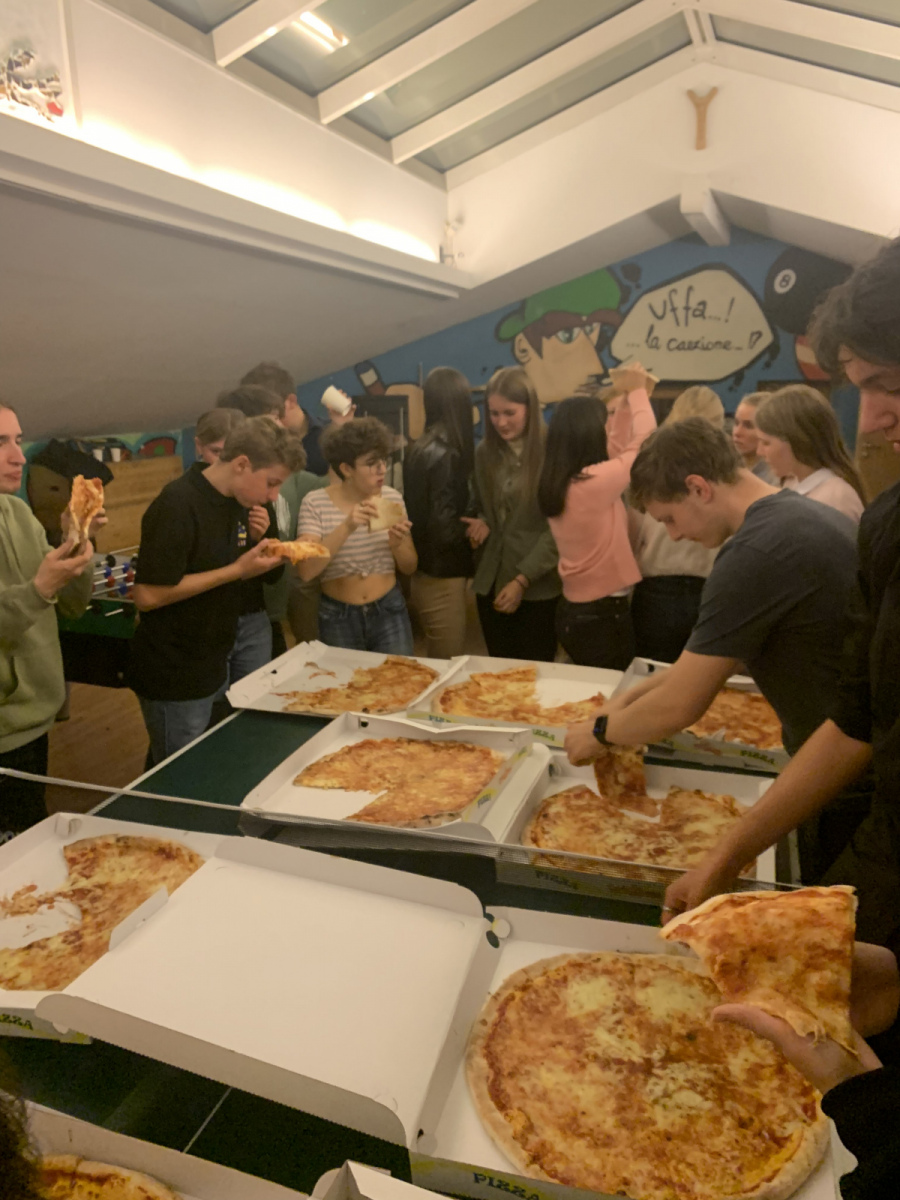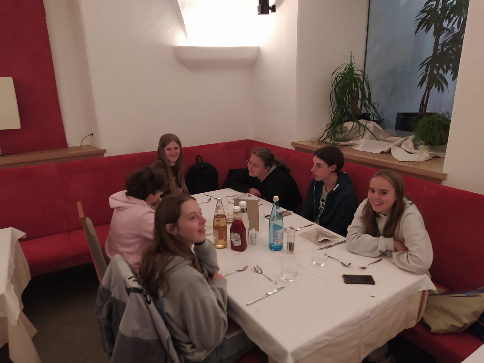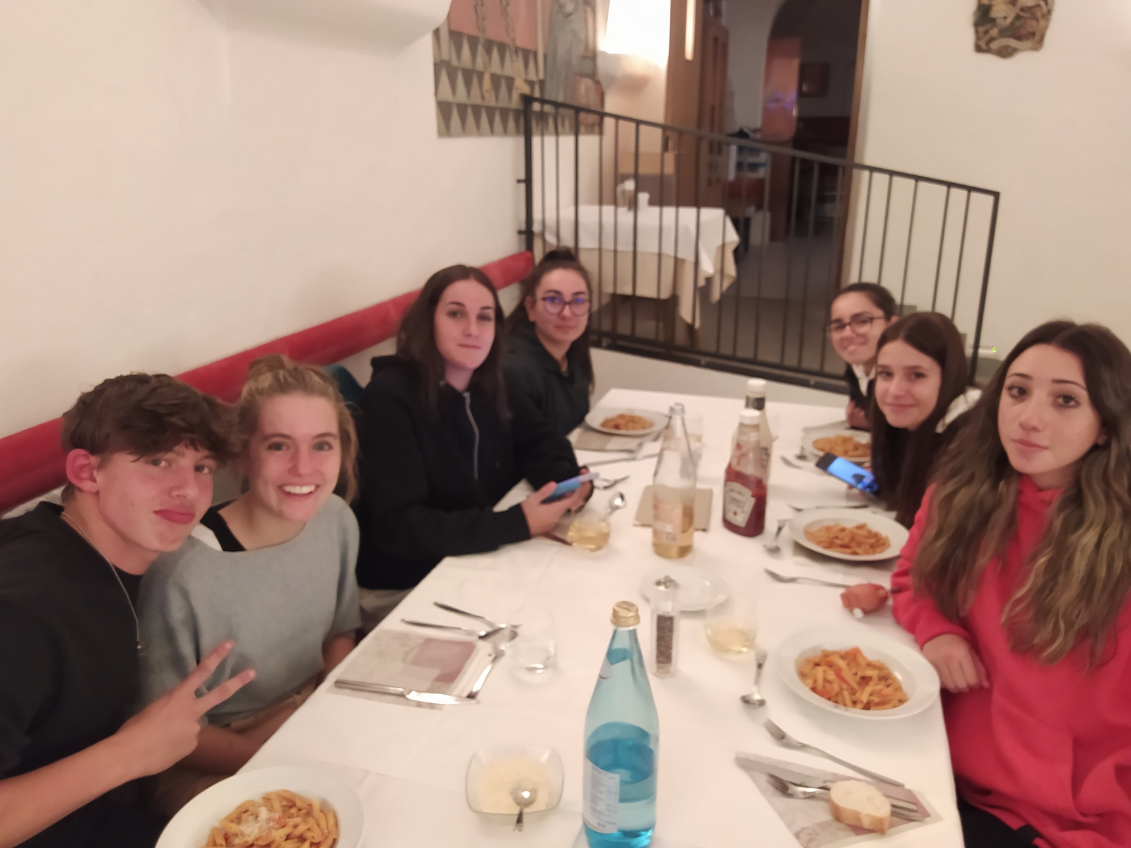 Das Austausch-Treffen begann am Abend des 17. September mit der Ankunft des Busses der Gäste. Die TeilnehmerInnen hatten bei einem gemütlichen Abendessen mit Pizza und Pasta Gelegenheit, sich kennenzulernen. Der Besitzer des Restaurants öffnete sogar exklusiv für die Gruppe die Disko im oberen Stock, wo sich die SchülerInnen bei Musik in lockerer Atmosphäre unterhalten konnten. Anschließend wurden die SchülerInnen von ihren Gastfamilien abgeholt.