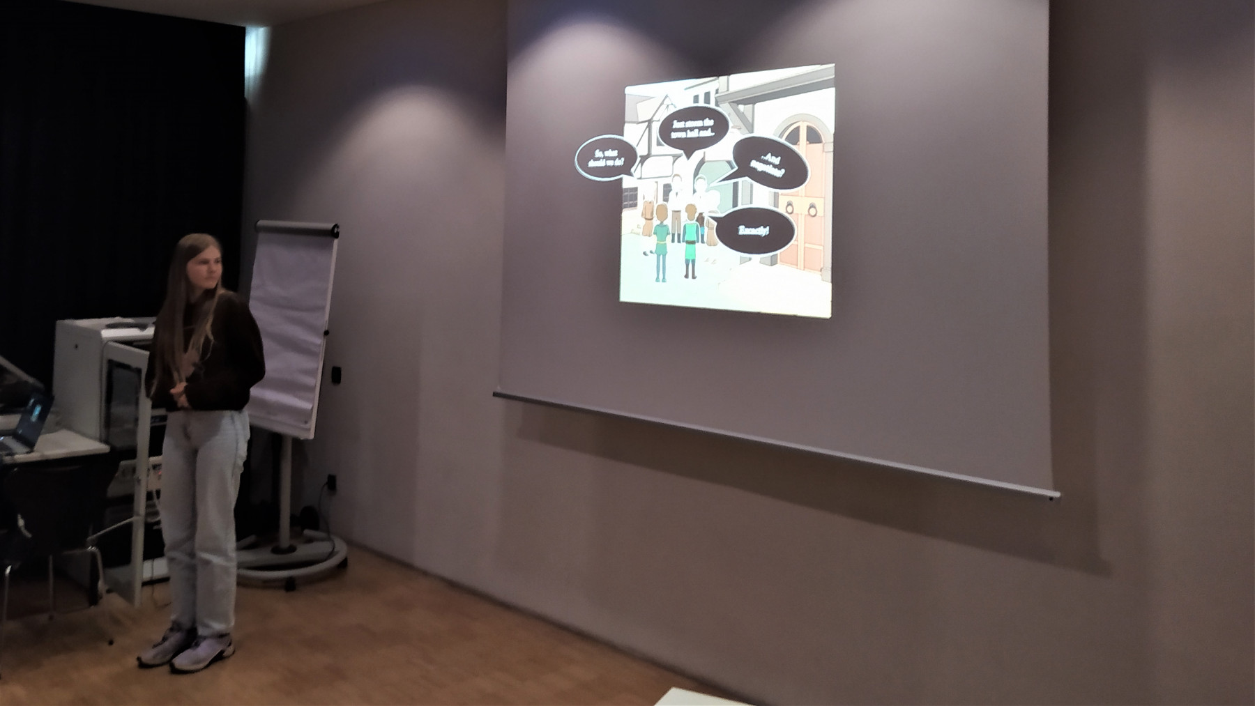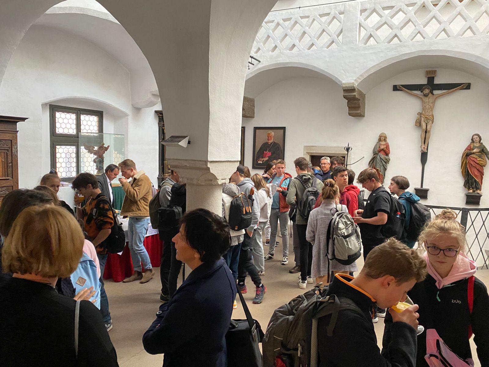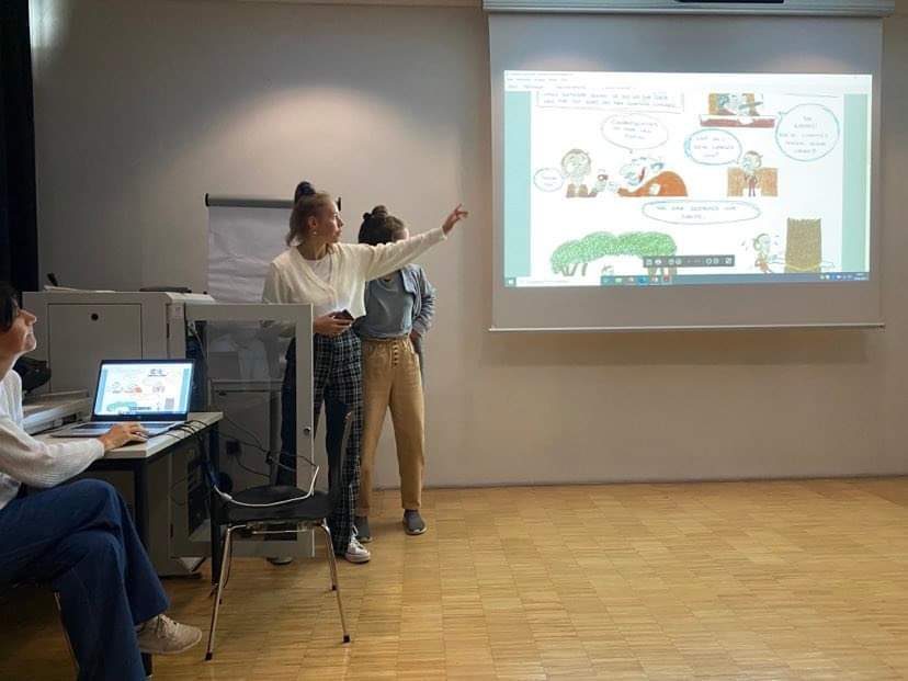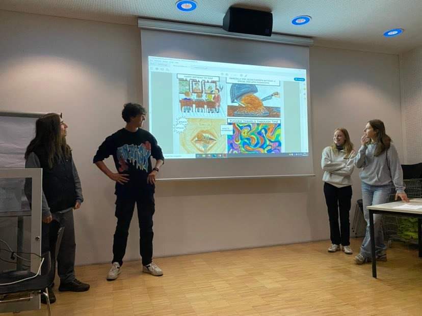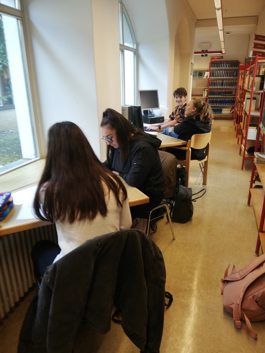 Der Montag war ein sehr arbeitsreicher Tag. Die Projektgruppe traf sich am Morgen im Medienraum der Schule. Frau Mayr und Frau Messner begrüßten die Gruppe und stellten das Programm der Woche vor. Die Direktorin der Schule, Frau Putzer, kam dazu, begrüßte die Schülerinnen und Schüler und die Lehrkräfte und freute sich über die vielen Geschenke der Partnerschulen. Die Sterzinger Gruppe führten ihre Gäste dann durch die Schule. Anschließend präsentierte jede Schule den Comic, den sie zu Hause auf den Spuren von Jakob Fugger in ihrer jeweiligen Stadt vorbereitet hatte.