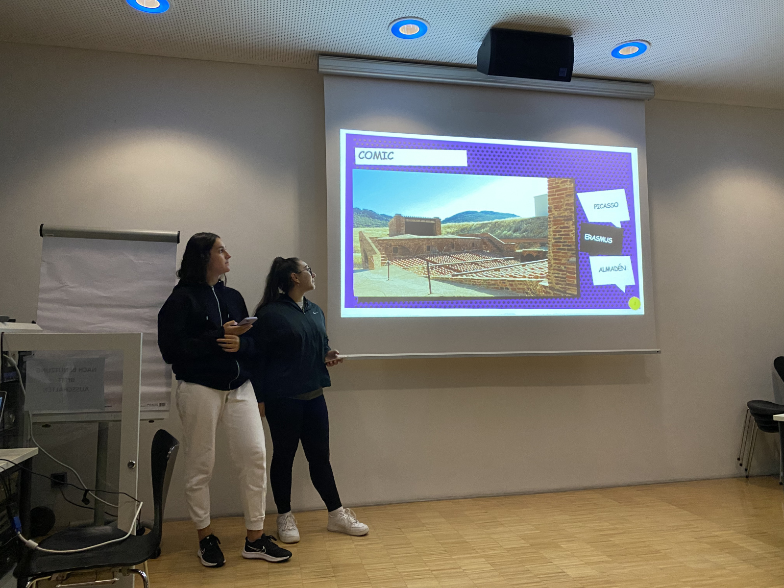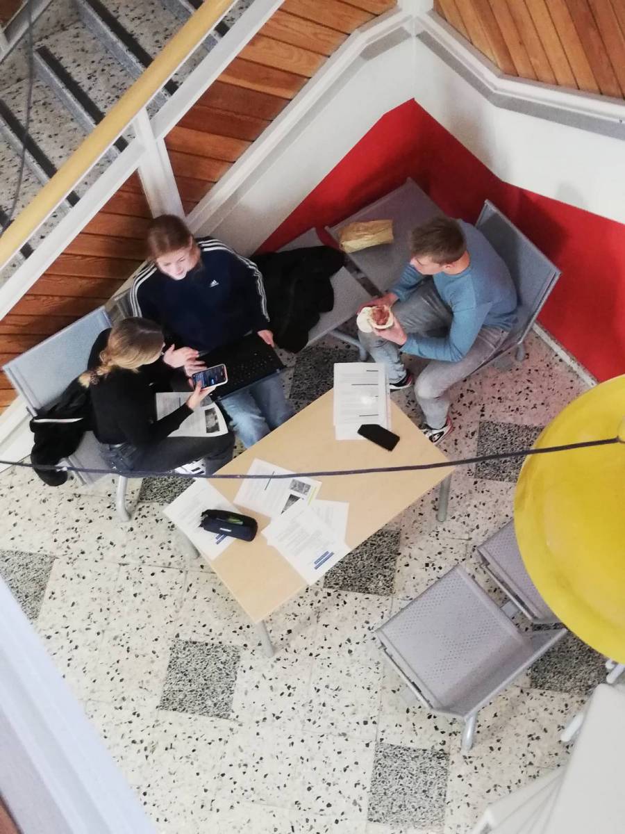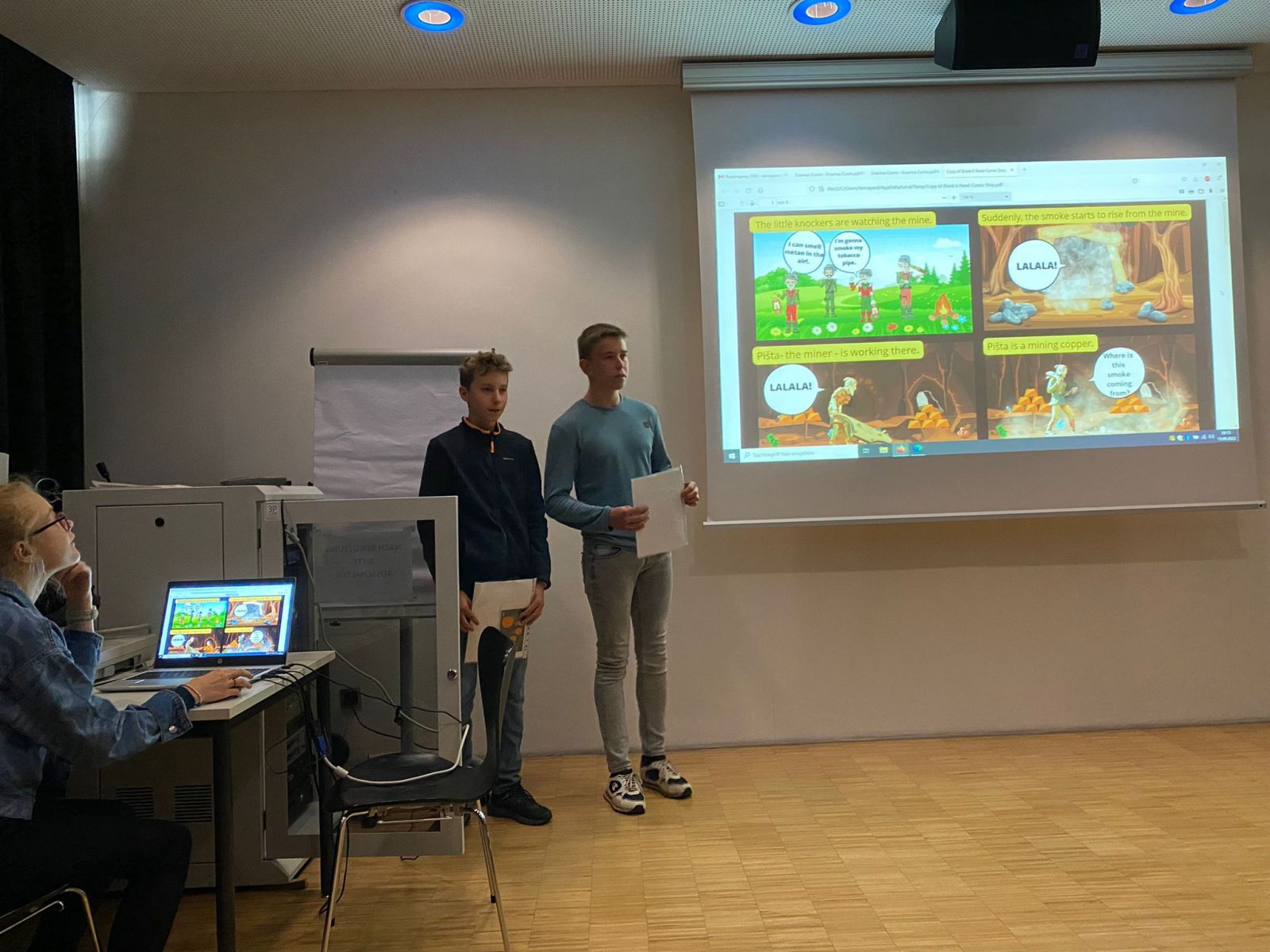 Der Montag war ein sehr arbeitsreicher Tag. Die Projektgruppe traf sich am Morgen im Medienraum der Schule. Frau Mayr und Frau Messner begrüßten die Gruppe und stellten das Programm der Woche vor. Die Direktorin der Schule, Frau Putzer, kam dazu, begrüßte die Schülerinnen und Schüler und die Lehrkräfte und freute sich über die vielen Geschenke der Partnerschulen. Die Sterzinger Gruppe führten ihre Gäste dann durch die Schule. Anschließend präsentierte jede Schule den Comic, den sie zu Hause auf den Spuren von Jakob Fugger in ihrer jeweiligen Stadt vorbereitet hatte.