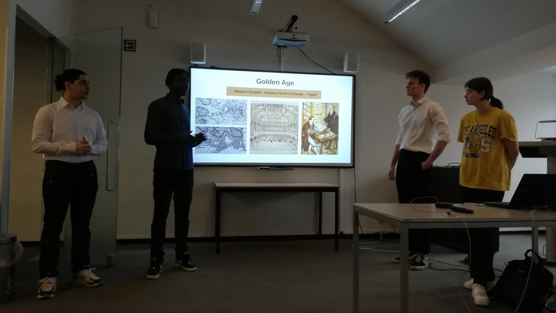 Anschließend kehrten alle in die Schule zurück, um sich auf das Fuggerforum vorzubereiten. Während dieser Präsentation, die per Live-Stream verfolgt werden konnte, sprachen zwei Hauptredner zu den Zuhörern. Der erste war Professor G. Marnef, der über Antwerpen in der Zeit von Jakob Fugger sprach. Er betonte, dass die Stadt dank Menschen wie Fugger im 16. Jahrhundert zum größten Hafen Europas wurde. Auf ihn folgte eine kurze Rede von L. Van Looveren, einem VOKA-Delegierten, der die Bedeutung unseres Hafens im 21. Antwerpen ist und bleibt der Motor Flanderns mit fast 200.000 Arbeitsplätzen und einem enormen Umsatz.