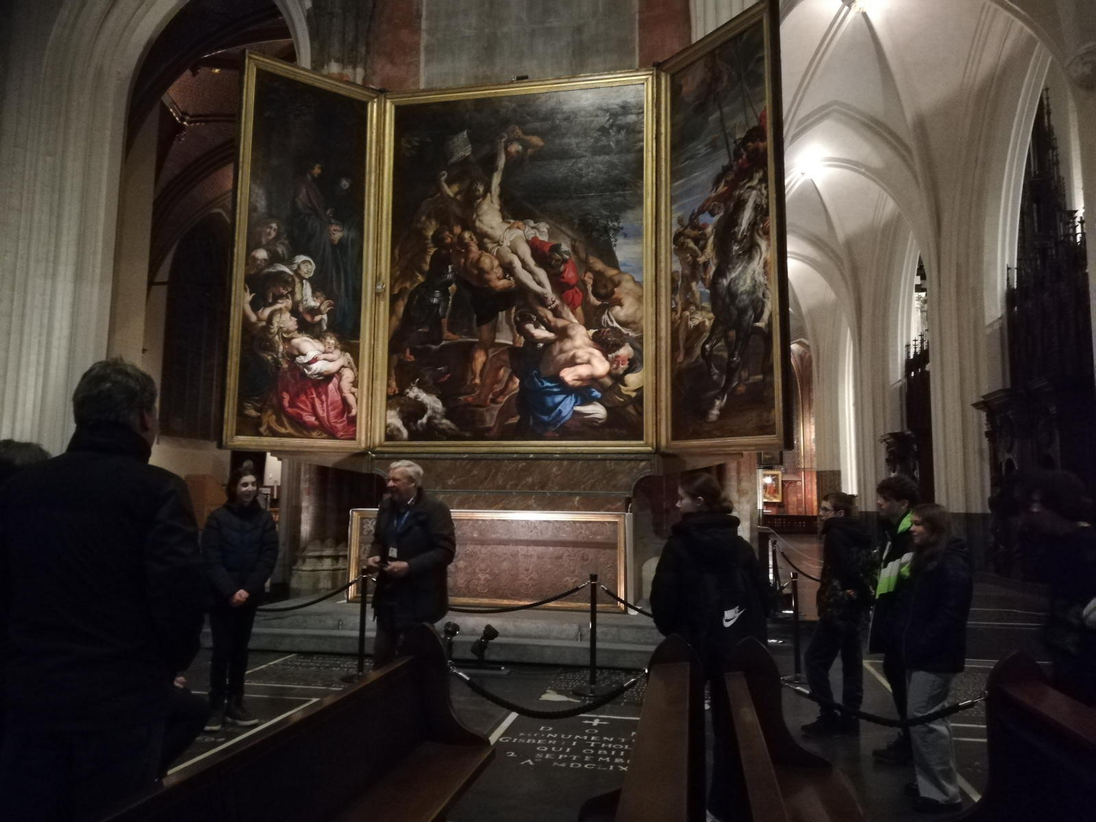 Der Höhepunkt des Tages war der exklusive Abendbesuch in der Kathedrale. Pfarrer Bart Paepen begrüßte die Gruppe und erklärte das Konzept einer gotischen Kirche: Harmonie und Licht sind die Schlüsselbegriffe. In der Kirchenhalle waren alle von dem beeindruckenden Orgelspiel des Organisten Peter Van de Velde beeindruckt. Die Gäste durften exklusiv den kleinen Turm der Kathedrale besichtigen und erhielten anschließend eine Führung durch dieses phantasievolle Gebäude. Sie bestaunten die Meisterwerke von Rubens, erfuhren die Geschichte von Nello und Patrache und bewunderten schließlich das Glasfenster mit der Darstellung der Bekehrung des heiligen Paulus, das Anton Fugger der Kathedrale gestiftet hatte und das als einziger greifbarer Beweis für die Präsenz der Fugger-Dynastie in Antwerpen gilt.