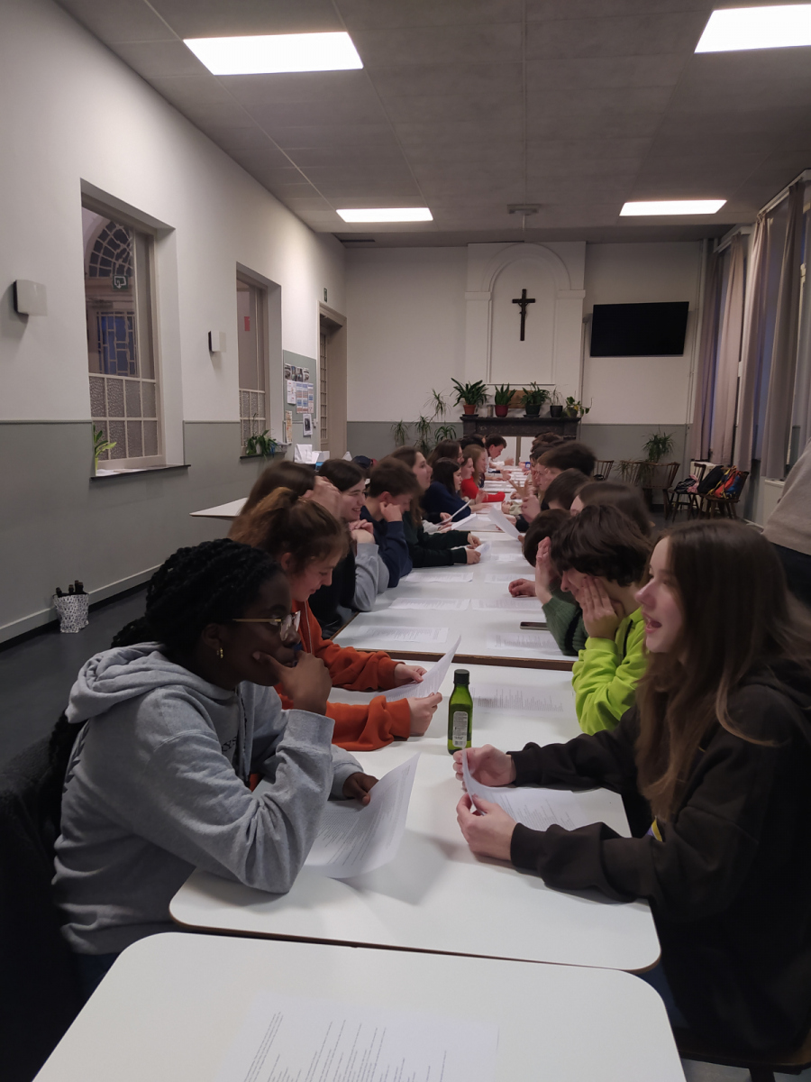 Am Freitag, den 10. März, wurde der Unterricht glücklicherweise nicht durch einen Streik im öffentlichen Nahverkehr gestört. Anhand des Gedichts „A Minimum“ des städtischen Dichters Ramsey Nasr untersuchten die Schüler, was ein Mensch als Minimum braucht, um in ihrem Land zu überleben. Das Ergebnis ihrer Arbeit ist eine Videobotschaft, die auf der Website zu sehen ist. Am Nachmittag wurde die Gruppe im Rathaus von der stellvertretenden Bürgermeisterin Nabilla Aid Daoud empfangen, gefolgt von einer Rede der Schulleiterin Cécile Veraert. Zum Abschluss des Tages wurde eine Führung durch die so genannte „Schöne Etage“ angeboten. Die Gruppe wurde in drei Gruppen aufgeteilt, und drei Führer zeigten ihnen die Mappe, in der die ursprüngliche Stadtverfassung aufbewahrt wurde. Nach einigen spontanen Eheschließungen zwischen Schülern im Hochzeitssaal (Ring und Kuss und alles inklusive) besuchte die Gruppe die Ratskammer, in der seit 1221 alle politischen Entscheidungen getroffen werden, und erfuhr die Geschichte der olympischen Flagge, die nach fast 100 Jahren in die Stadt zurückkehrte. Am Abend kam die Projektgruppe zur Abschlussveranstaltung der Woche zusammen. Bei der Bewertungsrunde konnten sich die Schüler gegenseitig beglückwünschen. Es wurden Urkunden verliehen, und der Abend wurde mit einem leckeren Dessertbuffet und Tanz abgerundet.