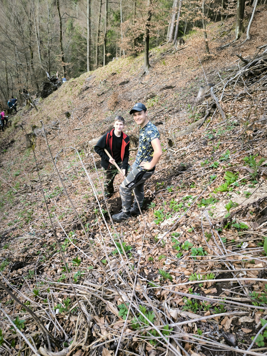 Today, Tuesday, April 9th, 8th and 9th grade students took part in an interesting project in the Laskomer Valley. In order to offset the carbon footprint left behind during our Erasmus+ trips abroad, the students and I decided to actively contribute to environmental protection. In the framework of cooperation with the Banská Bystrica Urban Forests, under the leadership of Ing. Jozef Jankov and his collaborators, they started planting trees.