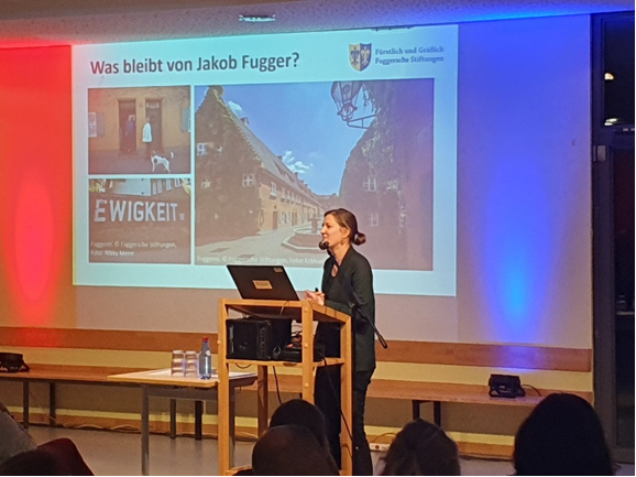 Abgerundet wurde der Abend, der von Johanna Cyrus, Q12 und Lenno Sarhage, 11b professionell moderiert wurde, durch einen Vortrag von Frau Peller als Vertreterin der Fürstlich Gräflich Fuggerschen Stiftungen zu Jakob Fugger in seinem 500 Todesjahr.