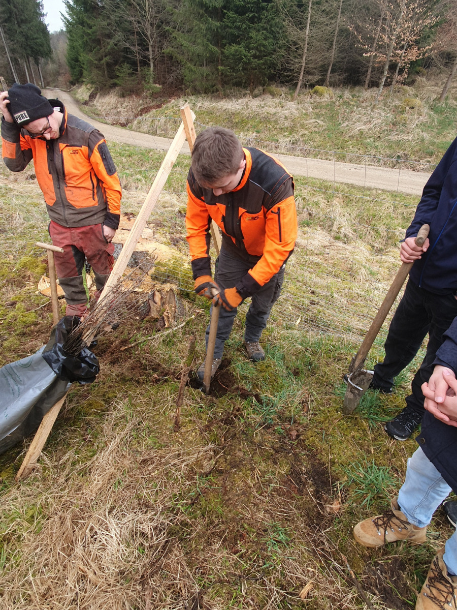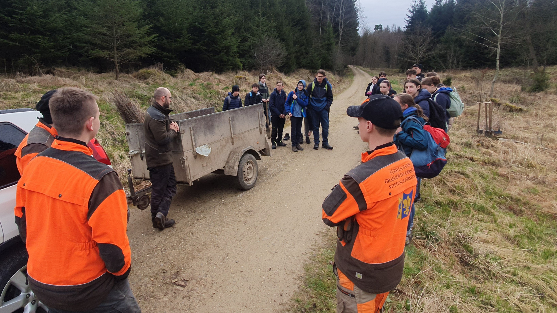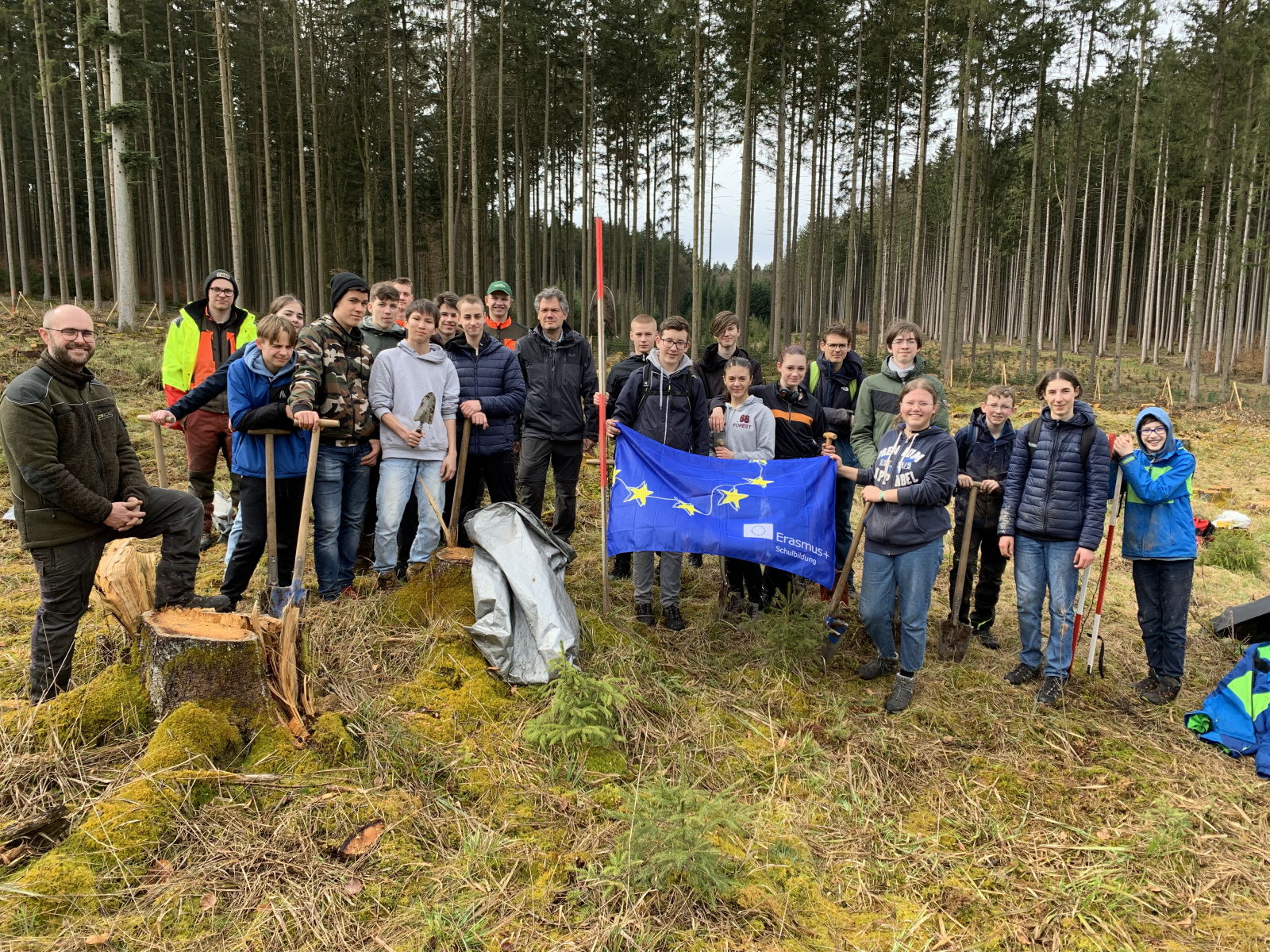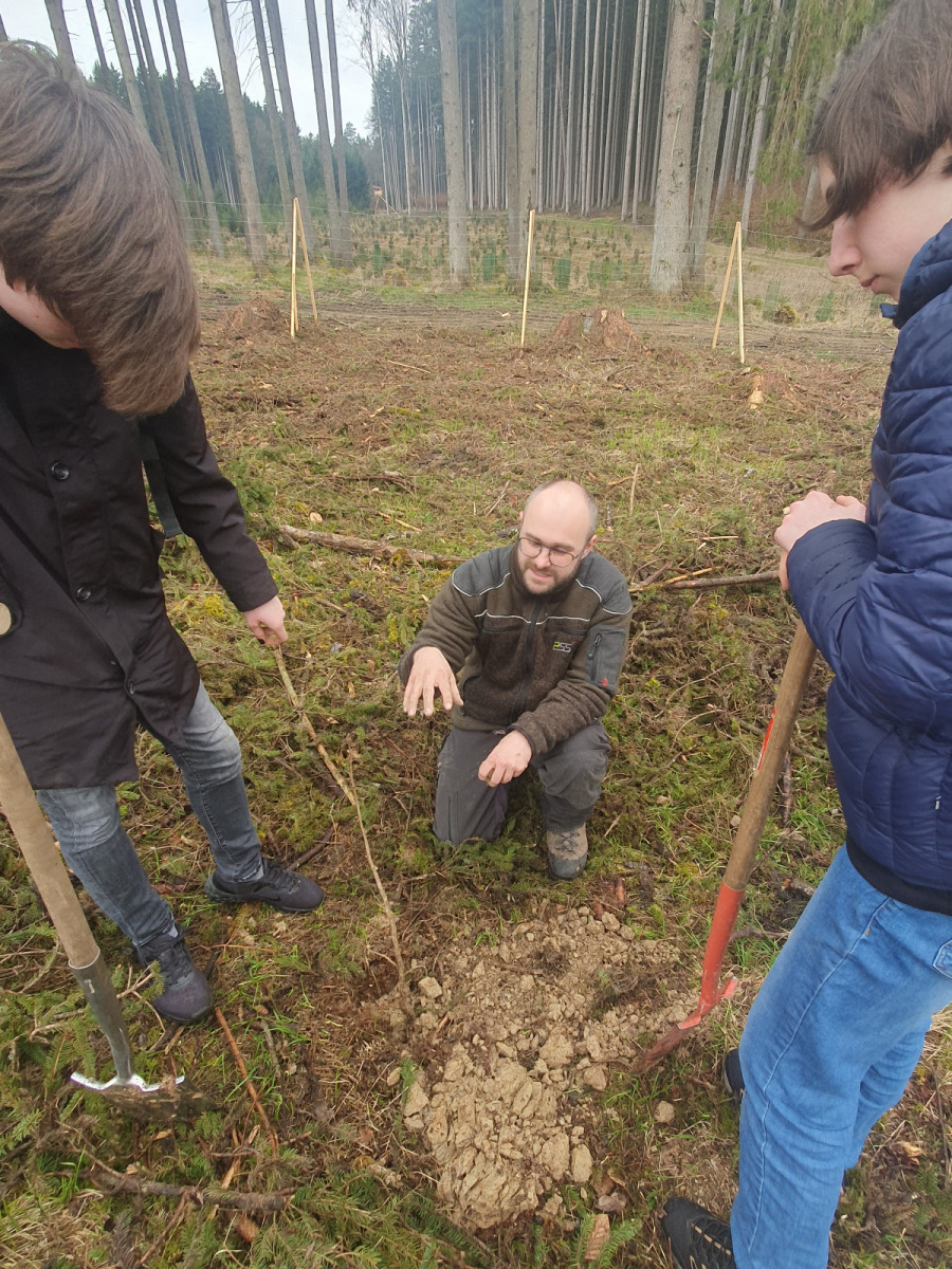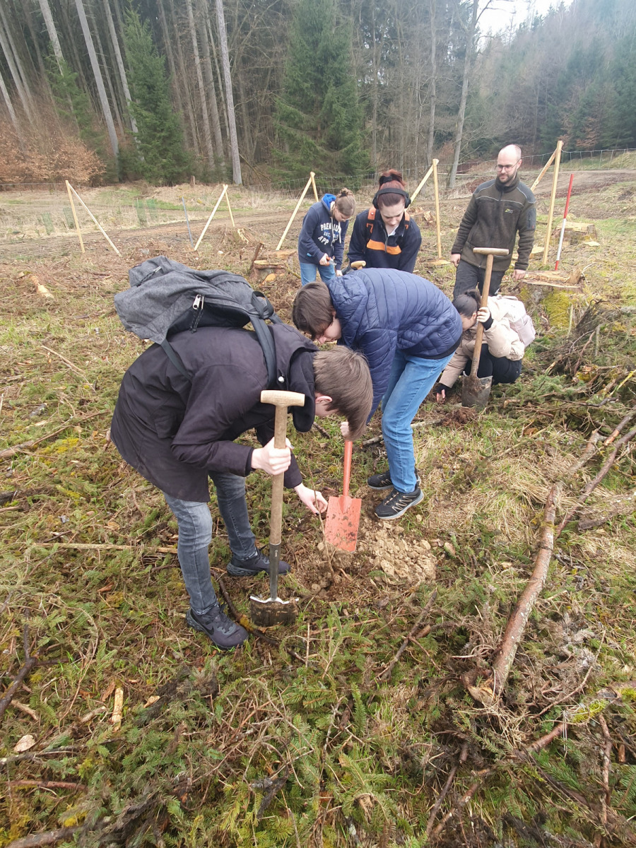 On 24.03.23 the Erasmus+ team together with five students from the environmental working club was able to reforest in the forest of the Fugger foundations near Emersacker. The forest engineer and district manager Johannes Mayer welcomed the team together with his staff and trainees in a piece of forest that had previously been infested by the bark beetle. Mr Mayer first explained what it means to compensate CO2 by planting trees and then went into great detail about the current problems of the forest due to climate change. Especially the drought of the last few years is also intensely felt in his district and changes in the area of the new planting carried out are then also derived from this, such as the mixture of traditional oak as a high-quality and sustainable CO2-rich wood supplier in combination with tree hazel, a tree species new to the region, which is supposed to be particularly resistant to the influences of climate change, but as Lukas appropriately summarised, CO2 compensation is much more than «digging holes and sticking trees in».