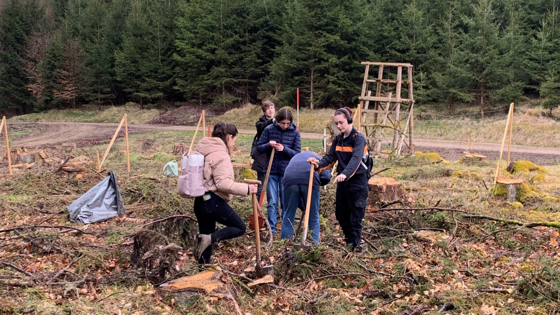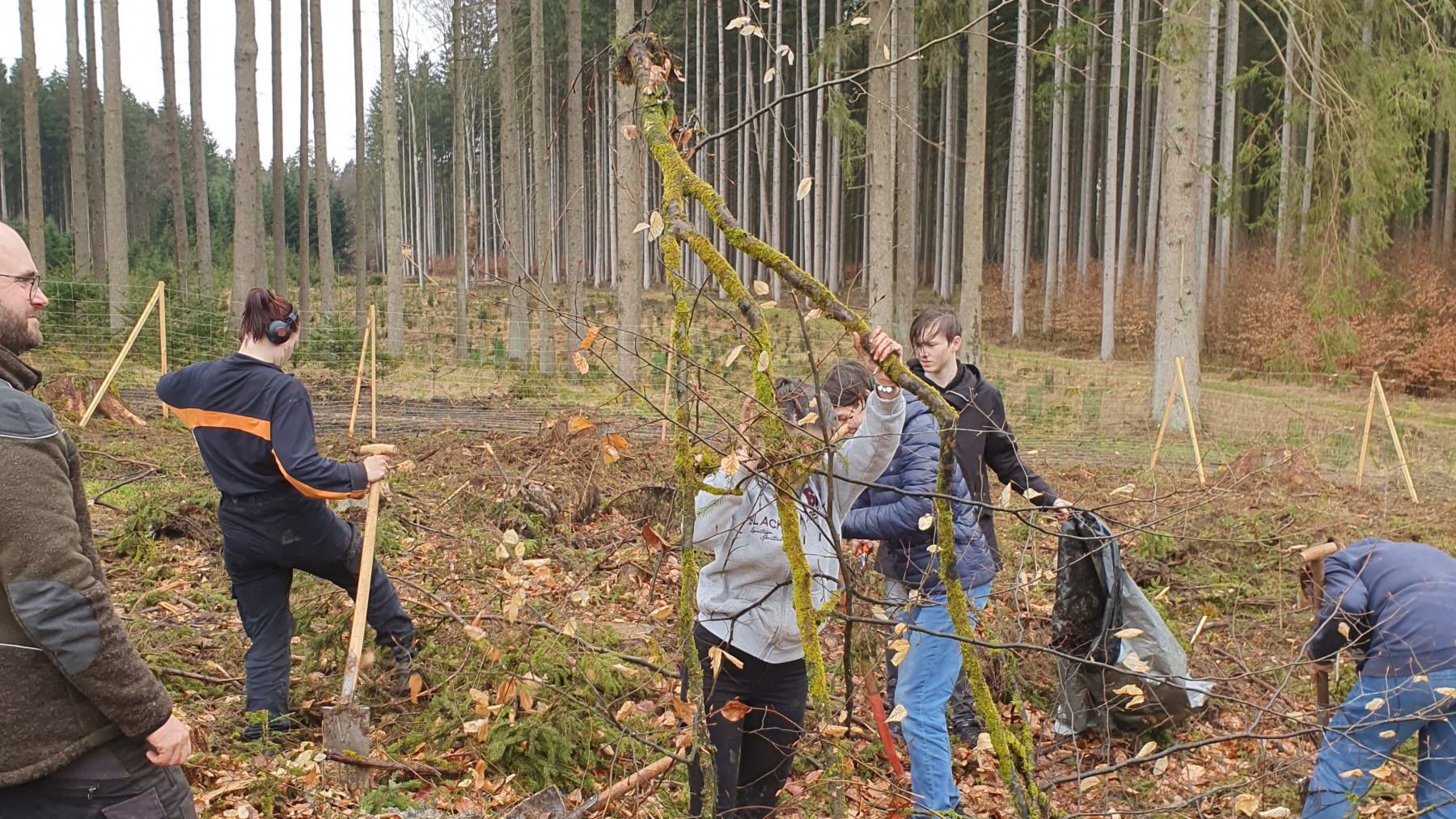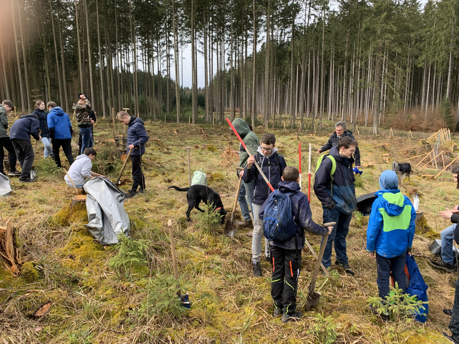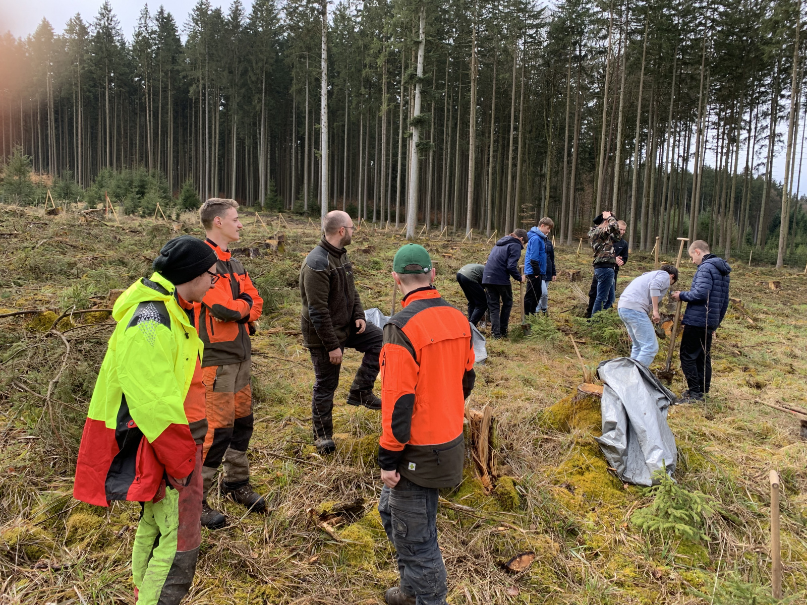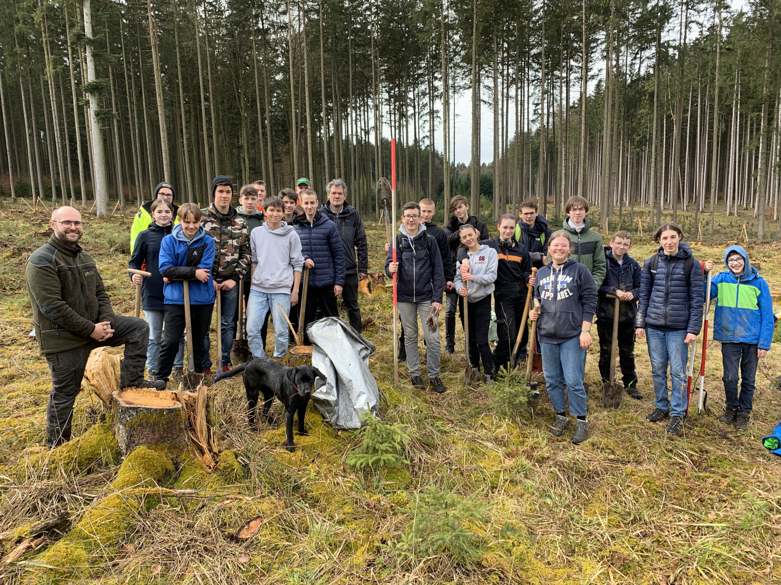 On 24.03.23 the Erasmus+ team together with five students from the environmental working club was able to reforest in the forest of the Fugger foundations near Emersacker. The forest engineer and district manager Johannes Mayer welcomed the team together with his staff and trainees in a piece of forest that had previously been infested by the bark beetle. Mr Mayer first explained what it means to compensate CO2 by planting trees and then went into great detail about the current problems of the forest due to climate change. Especially the drought of the last few years is also intensely felt in his district and changes in the area of the new planting carried out are then also derived from this, such as the mixture of traditional oak as a high-quality and sustainable CO2-rich wood supplier in combination with tree hazel, a tree species new to the region, which is supposed to be particularly resistant to the influences of climate change, but as Lukas appropriately summarised, CO2 compensation is much more than «digging holes and sticking trees in».