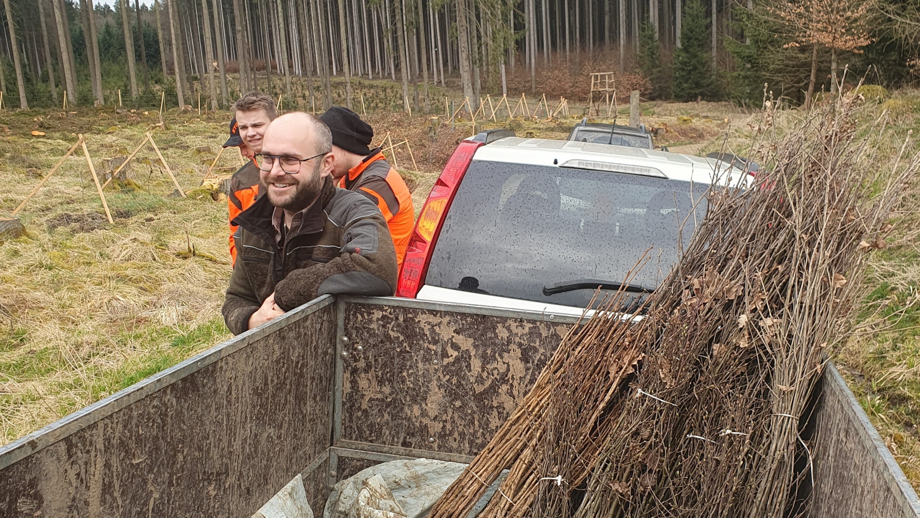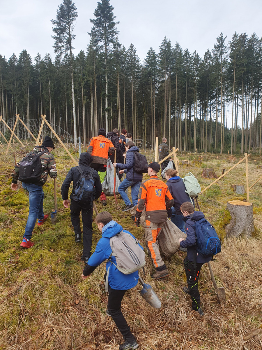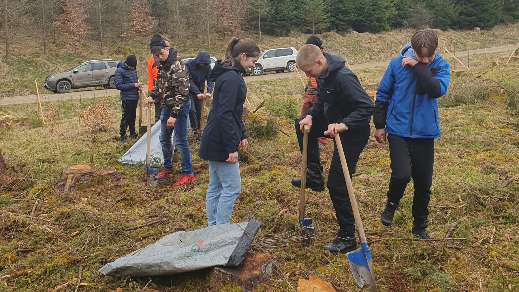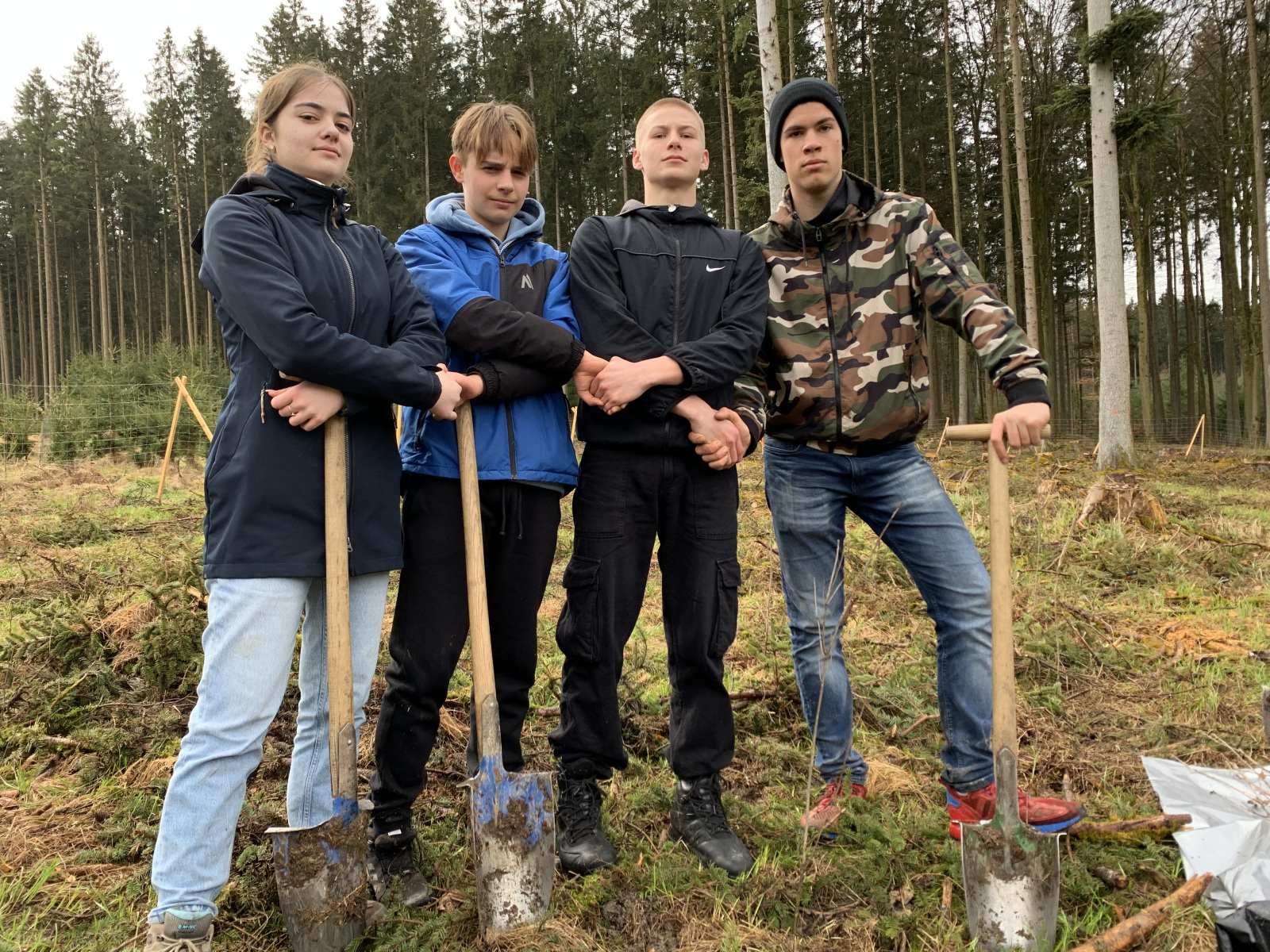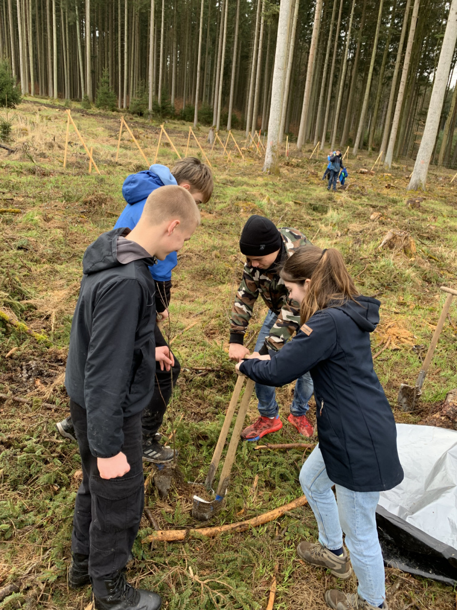 On 24.03.23 the Erasmus+ team together with five students from the environmental working club was able to reforest in the forest of the Fugger foundations near Emersacker. The forest engineer and district manager Johannes Mayer welcomed the team together with his staff and trainees in a piece of forest that had previously been infested by the bark beetle. Mr Mayer first explained what it means to compensate CO2 by planting trees and then went into great detail about the current problems of the forest due to climate change. Especially the drought of the last few years is also intensely felt in his district and changes in the area of the new planting carried out are then also derived from this, such as the mixture of traditional oak as a high-quality and sustainable CO2-rich wood supplier in combination with tree hazel, a tree species new to the region, which is supposed to be particularly resistant to the influences of climate change, but as Lukas appropriately summarised, CO2 compensation is much more than «digging holes and sticking trees in».
