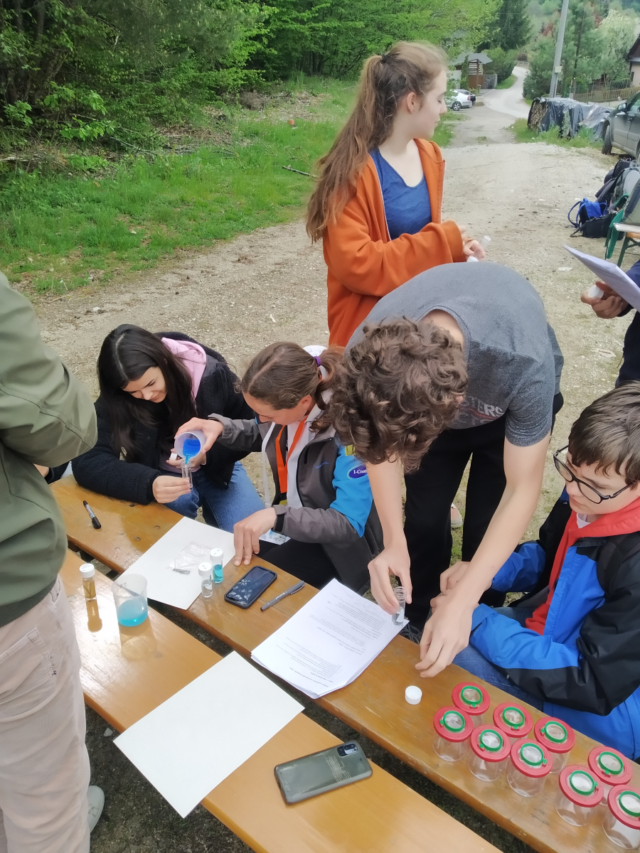 After lunch, the pupils went to Špania Dolina, the place with the oldest mention of copper mining in the region. After the visit to the Copper Museum, the pupils’ vocabulary was enriched with new terms such as cementing water, smeltering, copper hammer mill, Herrengrunder cups, etc. As this ball of theoretical information was only getting bigger, it had to be untangled practically. That was when the real «festival of science and research» could have begun. The Biology and Chemistry teachers prepared amazing worksheets for the pupils, aimed at discovering the secrets of mining waters, searching for traces of blue stones, as well as the consequences of copper mining on plants, soil and water. Some students tried to solve the mystery of the «miracle water» through experiments. They discovered that it was the metamorphosis of less valuable iron into more valuable copper by the action of the mine’s cementing waters. Others found a link between names such as Giovanni Bellini, Tintoretto, Raphael and the azurite or malachite in the form of green pigment that these masters used in their paintings. Using a modern method, they prepared synthetic malachite and learned that the former copper roofs in Banská Bystrica are now green thanks to malachite. The research activities continued at the Maximilián mine heap and by the lake below it. By studying the biodiversity of plants and looking for traces of life in the water flowing out of the mine heap, the students could observe how mining activities have affected nature, which is only slowly recovering. Theoretically and practically, they prepared for the next day’s activities marked by the project’s environmental footprint.