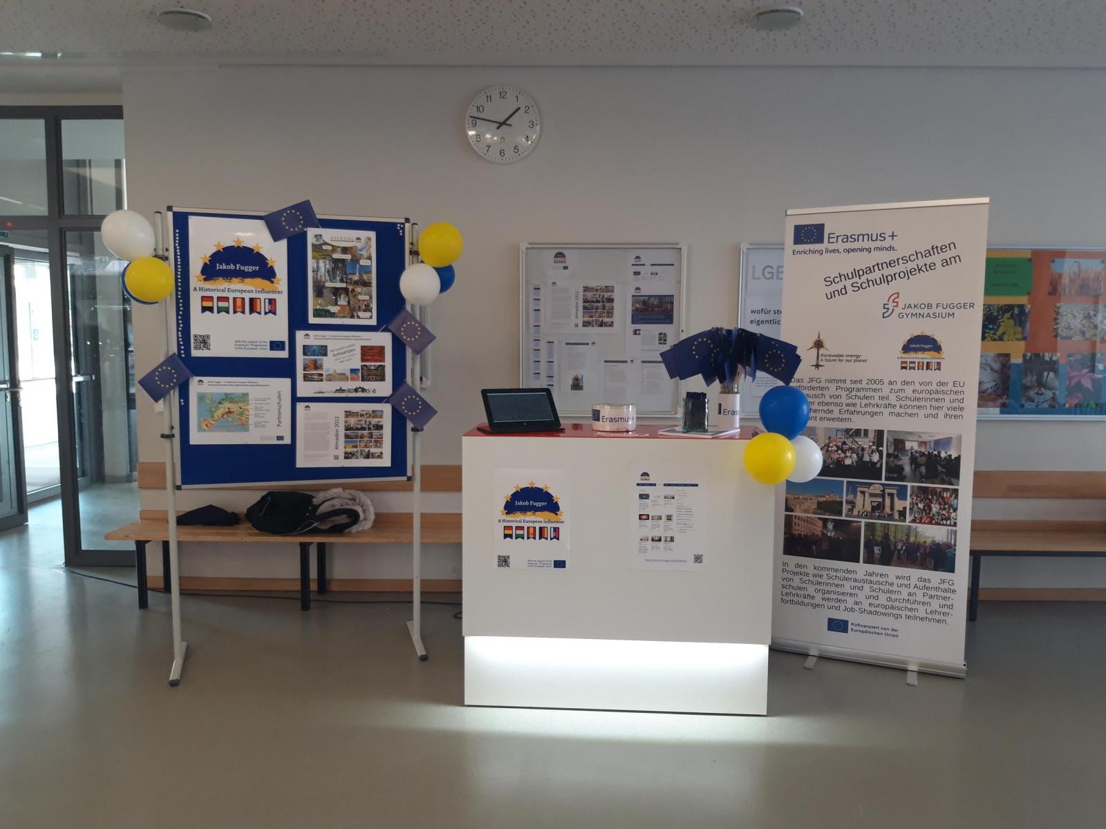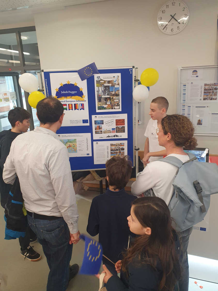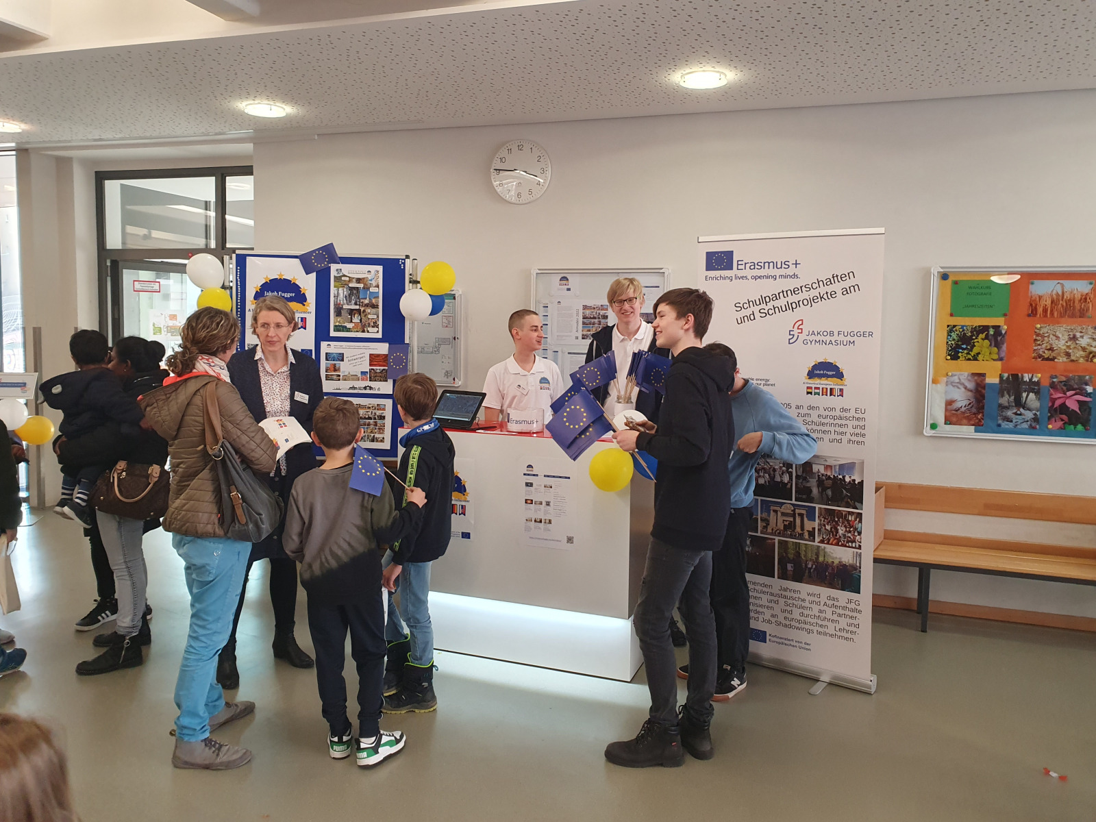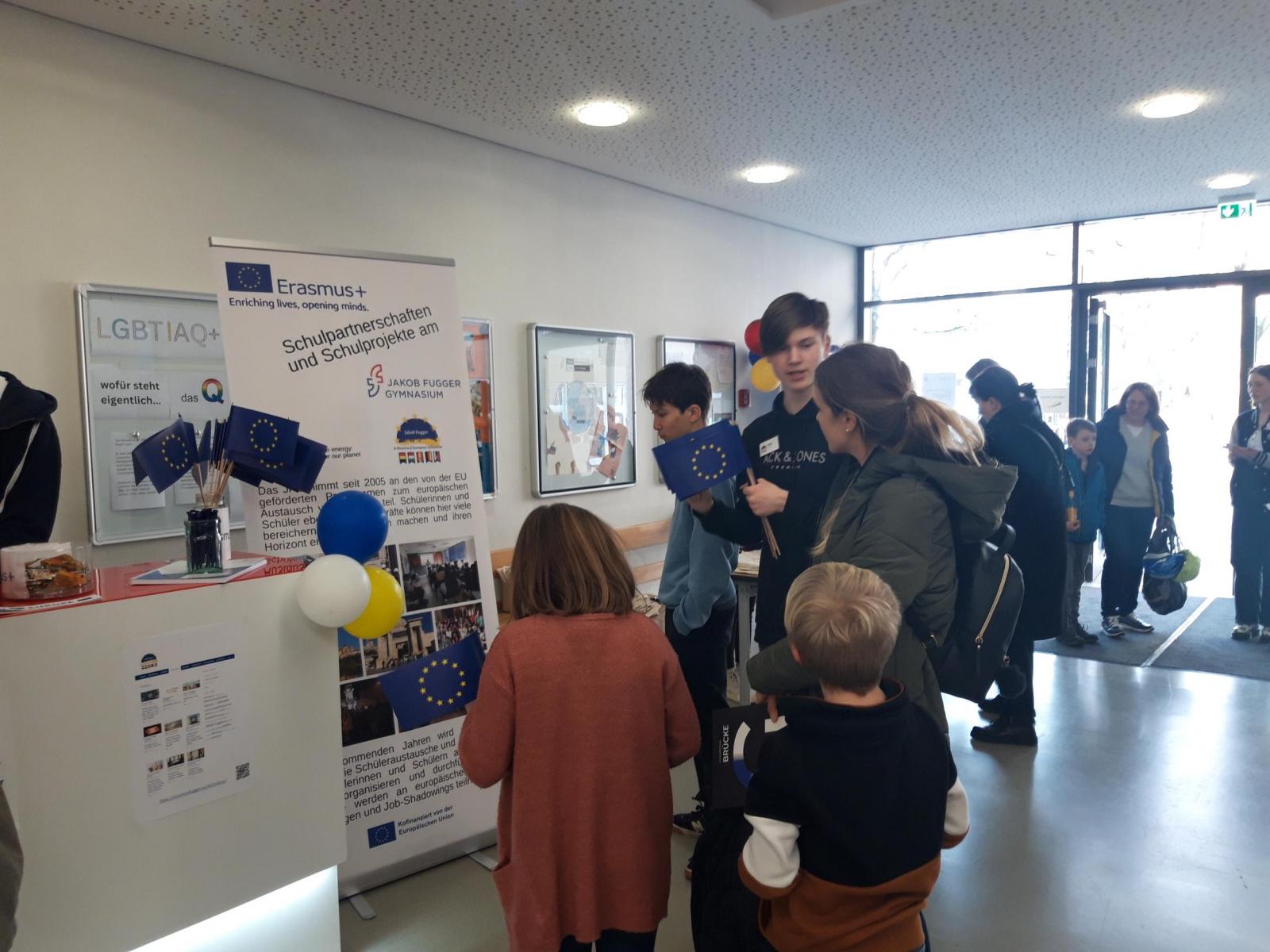 On 3.3.23 the Open Day at the Jakob-Fugger-Gymnasium took place. More than 250 families informed themselves on this afternoon about the diverse offers and of course the Erasmus+ team was also represented with its own information stand. There, the participating pupils informed the guests in detail about the ongoing project about Jakob Fugger and provided them with the matching Europe flags and the self-produced gummy bears with project logo and QR code to the website. At the same time, the JFG also presented itself as a school that will continue to carry out EU projects until 2027 within the framework of the accreditation it recently received. The feedback from the guests was great and our pupils participating in the project filled the role as „EU ambassadors“ perfectly.