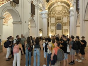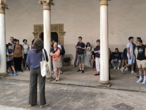 Following the school visit, participants embarked on a guided tour of Almagro’s historic city center. The tour included notable landmarks such as the Plaza Mayor, a central square that reflects the architectural influence of the Fugger family, who introduced Flemish design elements during their tenure in the region. The group also visited the Corral de Comedias de Almagro, the best-preserved example of a 17th-century open-air theatre in Spain. Additional highlights included the Iglesia de San Blas, where Jakob Fugger’s name is inscribed on the entrance portal, and the Fugger Palace, a key site in the town’s historical narrative.